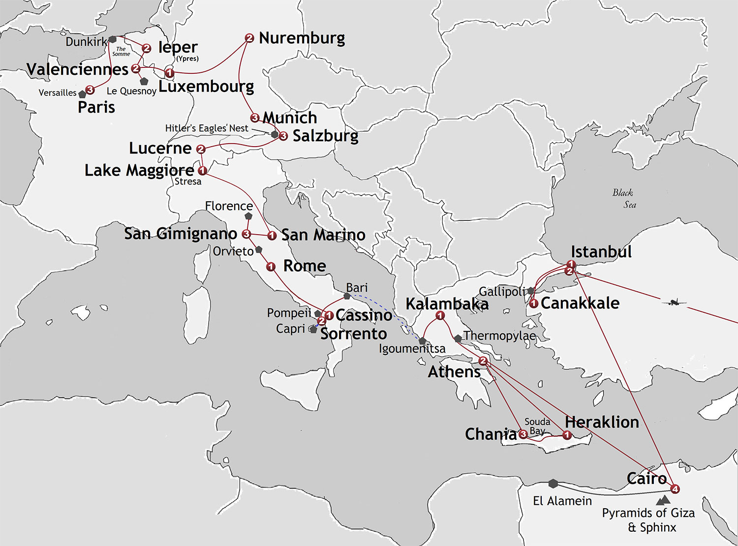 • Pay tribute at some of Europe's major WW1 & 2 theatres of war, where ANZAC troops fought leaving many dead and buried, or commemorated. Join a guided tour of some major battlefields, as well as visit Commonwealth War Cemeteries, including Gallipoli in Turkey, El Alamein in Egypt, Souda Bay in Crete, Cassino in Italy, Passchendaele in Belgium, and the Somme in France.