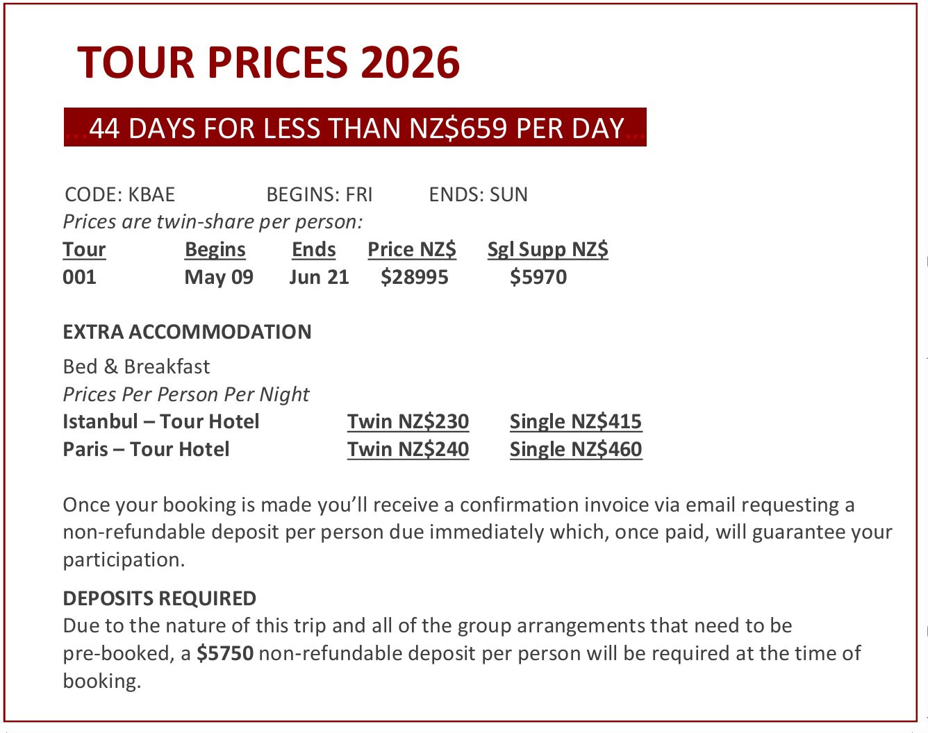 • Escorted from Istanbul (or Auckland) to Paris by EuroVista's experienced Tour Leader, Ken Bowie, and also EuroVista's European based Tour Leader, Federico Ereny, for the Greece and Italy sector.