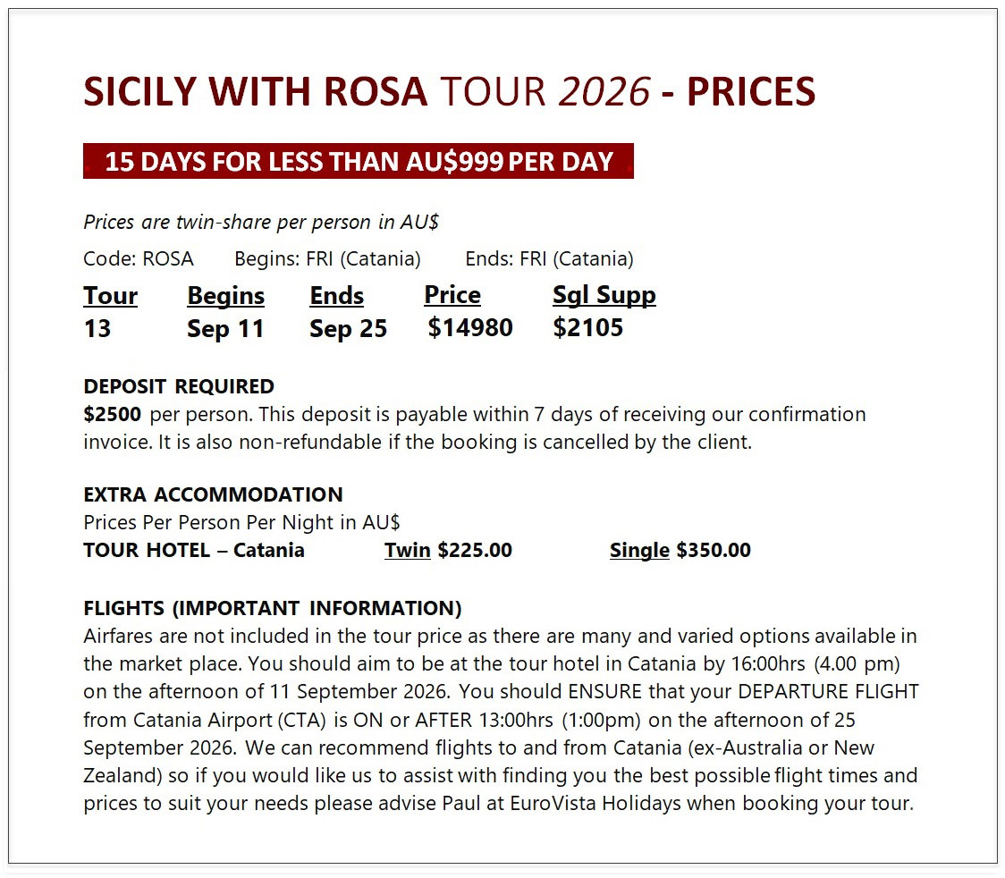fully-escorted 15-day holiday-with-a-difference in the beautiful Mediterranean island of Sicily. This exclusive, small-group tour is fully escorted by Rosa Mitchell - renowned for her successful Sicilian-inspired